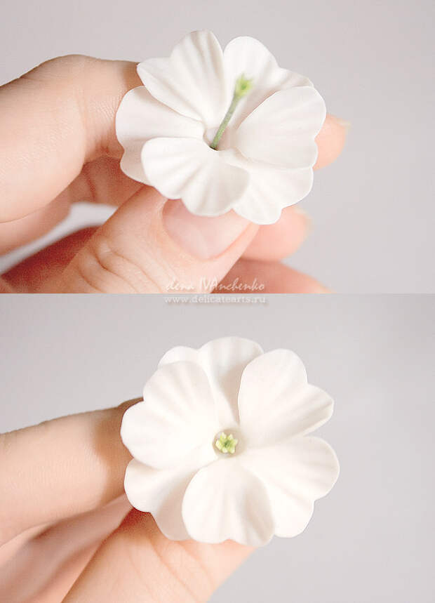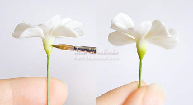 Теперь, не снимая цветка со стека, прикрепляем глину с обратной стороны цветка. Пока глина свежая, она примазывается очень хорошо, не оставляя стыков.