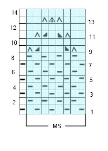 лиц., 2 п. вместе слева, 1 нак., 1 п. лиц; 2-й ряд и все четные ряды: вязать как смотрят петли, накиды - изнаночными. 3-й ряд: 2 п. лиц, 1 нак., 2 п. лиц., 2 п. вместе справа, * 1 п. лиц., 2 п. лиц., 2 п. вместе слева, 2 п. лиц., 1 кнак., 1 п. лиц., 1 нак., 2 п. лиц., 2 п. вместе справа *, повторяем от * до *, 1 п. лиц., 2 п. вместе слева, 2 п. лиц., 1 нак., 2 п.лиц.; 5-й ряд: 3 п. лиц., 1 нак., 2 п. лиц.,* 3 п. вместе, 2 п. лиц., 1 нак., 5 п. лиц., 1 нак., 2 п. лиц. *, повторяем от * до *, 3 п. вместе, 2 п. лиц., 1 нак., 3 п. лиц; 7-й ряд: 4 п. лиц., 1 нак., 1 п. лиц., * 1 п. лиц., 2 п. вместе справа, 8 п. лиц., 1 нак., 1 п. лиц. *, повторяем от * до *, 1 п. лиц., 2 п. вместе справа, 5 п. лиц.; 9-й ряд: 5 п. лиц., 1 нак., * 2 п. лиц., 2 п. вместе спава,8 п. лиц., 1 нак. *, повторяем от * до *, 2 п. лиц., 2 п. вместе справа, 4 п. лиц.; 11-й ряд: 6 п. лиц., * 1 нак., 2 п. лиц., 2 п. вместе справа, 8 п. лиц. *, повторяем от * до *, 1 нак., 2 п. вместе справа, 3 п. лиц.; 13-й ряд: 2 п. лиц., 2 п. вместе слева, 2 п. лиц., 1 нак., * 1 п. лиц., 1 нак., 2 п. вместе справа, 3 п. лиц., 2 п. вместе слева, 2 п. лиц., 1 нак. *, повторяем от * до*, 1 п. лиц., 1 нак., 2 п. лиц., 2 п. вместе сврава, 2 п.