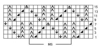 Число петель кратно 10 + 1. В четных рядах петли вязать по рисунку накиды вязать изнаночными. 1-й ряд: 3 п. лиц., 2 п. вместе слева, 1 нак., * 1 п. лиц., 1 нак.,1 протяжка (1 петлю снять как лицевую, 1 лицевая и протянуть ее через снятую петлю), 5 п. лиц., 2 п. вместе слева, 1 нак. *, повторять от * до *, 1 п. лиц., 1 нак., ,1 протяжак (1 петлю снять как лицевую, 1 лицевая и протянуть ее через снятую петлю),, 3 п. лиц.; 2-й и все четные: все петли изнаночными. 3-й ряд: 2 п. лиц., 2 п. вместе слева, 1 п. лиц., 1 нак, * 1 п. лиц., 1 нак., 1 п. лиц., ,1 протяжка (1 петлю снять как лицевую, 1 лицевая и протянуть ее через снятую петлю), 3. плиц., 2 п. вместе слева, 1 п. лиц., 1 нак. *, повторять от * до *, 1 п. лиц., 1 нак., 1 п. лиц., ,1 протяжка (1 петлю снять как лицевую, 1 лицевая и протянуть ее через снятую петлю), 2 п. лиц.; 5-й ряд: 1 п. лиц., 2 п. вместе слева, 2 п. лиц., 1 нак, * 1 п. лиц., 1 нак., 2 п. лиц., ,1 протяжка (1 петлю снять как лицевую, 1 лицевая и протянуть ее через снятую петлю), .1 п. лиц., 2 п. вместе слева, 2 п. лиц., 1 нак. *, повторять от * до *, 1 п. лиц., 1 нак., 2 п. лиц., ,1 протяжка (1 петлю снять как лицевую, 1 лицевая и протянуть ее через снятую петлю), 1 п. лиц.; 7-й ряд: 2 п. вместе слева, 3 п. лиц., 1 нак., * 1 п. лиц., 1 нак., 3 п. лиц., 3 п. вместе лиц., 3 п. лиц., 1 нак. *, повторять от * до *, 1 п. лиц., 1 нак., 3 п. лиц., ,1 протяжка (1 петлю снять как лицевую, 1 лицевая и протянуть ее через снятую петлю); 9-й ряд: 1 п. лиц., 1 нак., ,1 протяжка (1 петлю снять как лицевую, 1 лицевая и протянуть ее через снятую петлю), 2 п. лиц., * 3 п. лиц., 2 п. вместе слева, 1 нак., 1 п. лиц., 1 нак., ,1 протяжка (1 петлю снять как лицевую, 1 лицевая и протянуть ее через снятую петлю), 2 п. лиц. *, повторять от * до *, 3 п. лиц., 2 п. вместе слева, 1 нак., 1 п. лиц.; 11-й ряд: 1 п. лиц., 1 нак., 1 п. лиц.,1 протяжка (1 петлю снять как лицевую, 1 лицевая и протянуть ее через снятую петлю), 1 п. лиц., * 2 п. лиц., 2 п. вместе слева, 1 п. лиц., 1 нак., 1 п. лиц., 1 нак., 1 п. лиц., 1 протяжка (1 петлю снять как лицевую, 1 лицевая и протянуть ее через снятую петлю), 1 п. лиц. *, повторять от * до *, 2 п. лиц., 2 п. вместе слева, 1 п. лиц., 1 нак., 1 п. лиц.; 13-й ряд: 1 п. лиц., 1 нак., 2 п. лиц.,1 протяжка (1 петлю снять как лицевую, 1 лицевая и протянуть ее через снятую петлю), * 1 п. лиц., 2 п. вместе слева, 2 п. лиц., 1 нак., 1 п. лиц., 1 нак., 2 п. лиц., 1 протяжка (1 петлю снять как лицевую, 1 лицевая и протянуть ее через снятую петлю) *, повторять от * до *, 1 п. лиц., 2 п. вместе слева, 2 п. лиц., 1 нак., 1 п. лиц.; 15-й ряд: 1 п. лиц., 1 нак., 3 п. лиц., * 3 п. вместе лиц., 3 п. лиц., 1 нак, 1 п. лиц., 1 нак., 3 п. лиц. *, повторять от * до *, 3 п. вместе лиц., 3 п. лиц., 1 нак., 1 п. лиц.