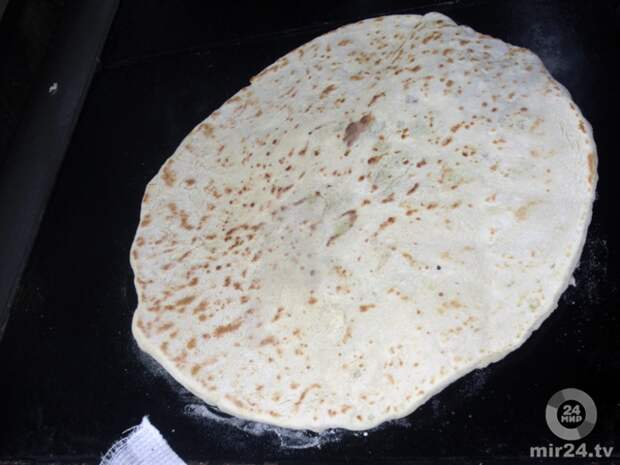Это еще не все! Когда лепешки готовы, Радимхан наливает в большую плоскую ёмкость кипяток и ловко обмакивает каждую в воду. Теперь надо смазать их растопленным сливочным маслом с двух сторон, порезать и подавать на стол горячими.