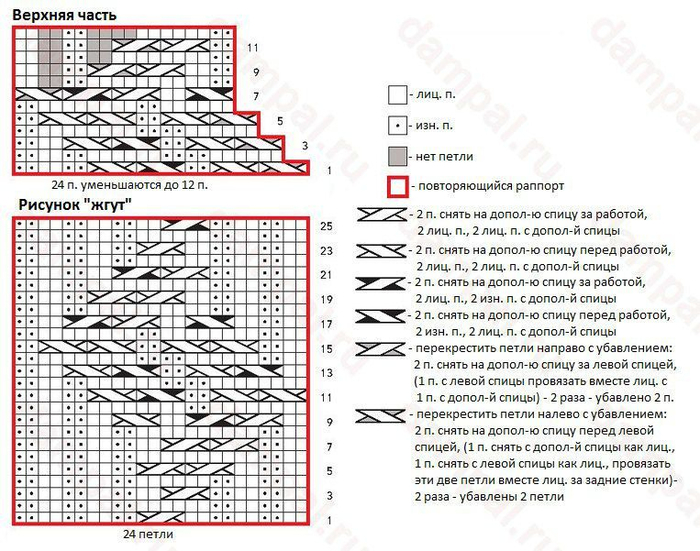 - 6 раз повт.: 2 лиц. п., 4 п. перекр. направо с убавл. – на спицах 24 п.;