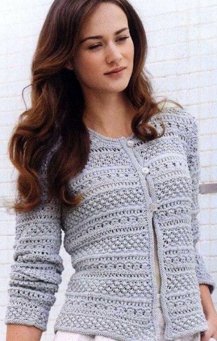 Укороченный жакет связан спицами. Жакет с множеством узоров позволит рукодельнице продемонстрировать свое виртуозное владение спицами. Узоры регулярно чередуются, и разделяют их лицевая или изнаночная гладь. Жакет застегивается только на три верхних пуговицы. Такой жакет лишь подчеркнет отменный вкус его обладательницы. Серый благородный цвет подчеркивает изысканность узоров этого восхитительного жакета. Как связать жакет, описание и схемы вязания Вы сможете найти далее в статье.