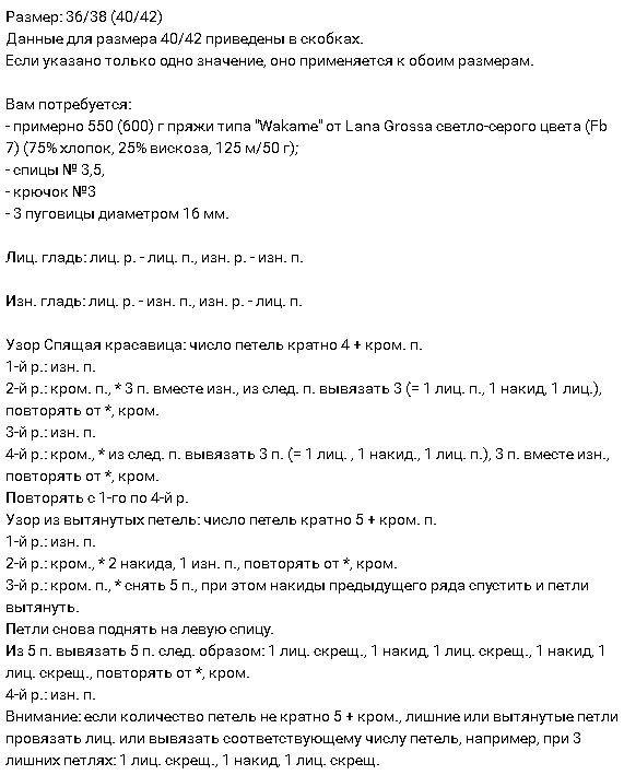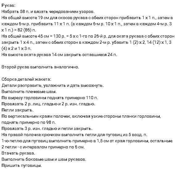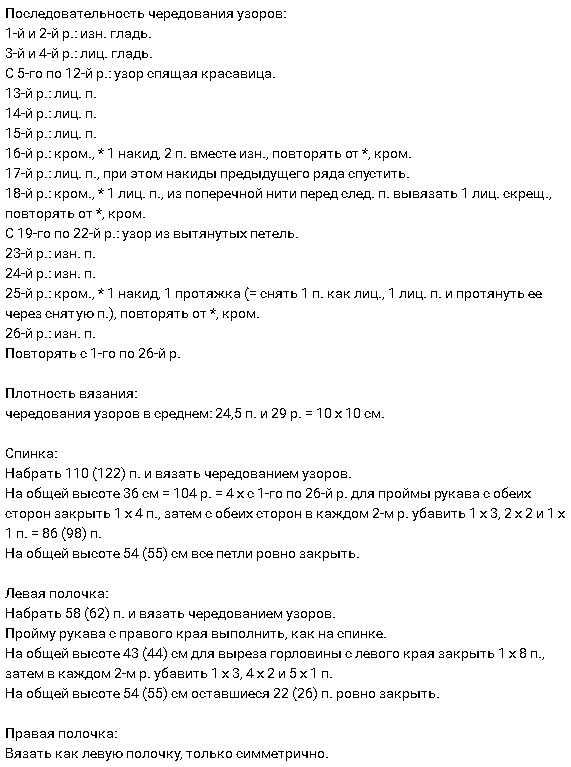 Плотность вязания: 30 п. x 29 р. арановым рисунком = 10 см х 10 см в нерастянутом виде.
